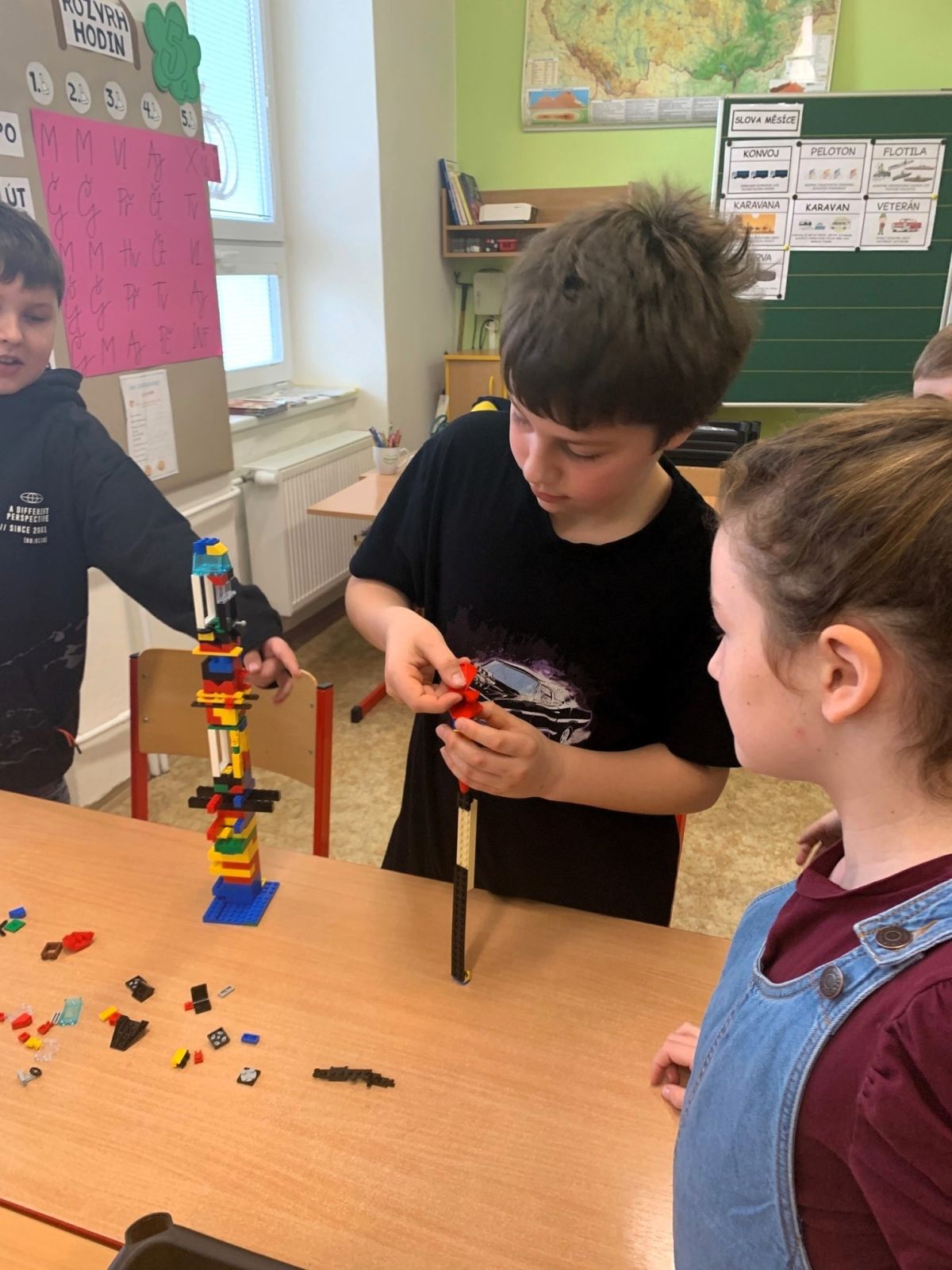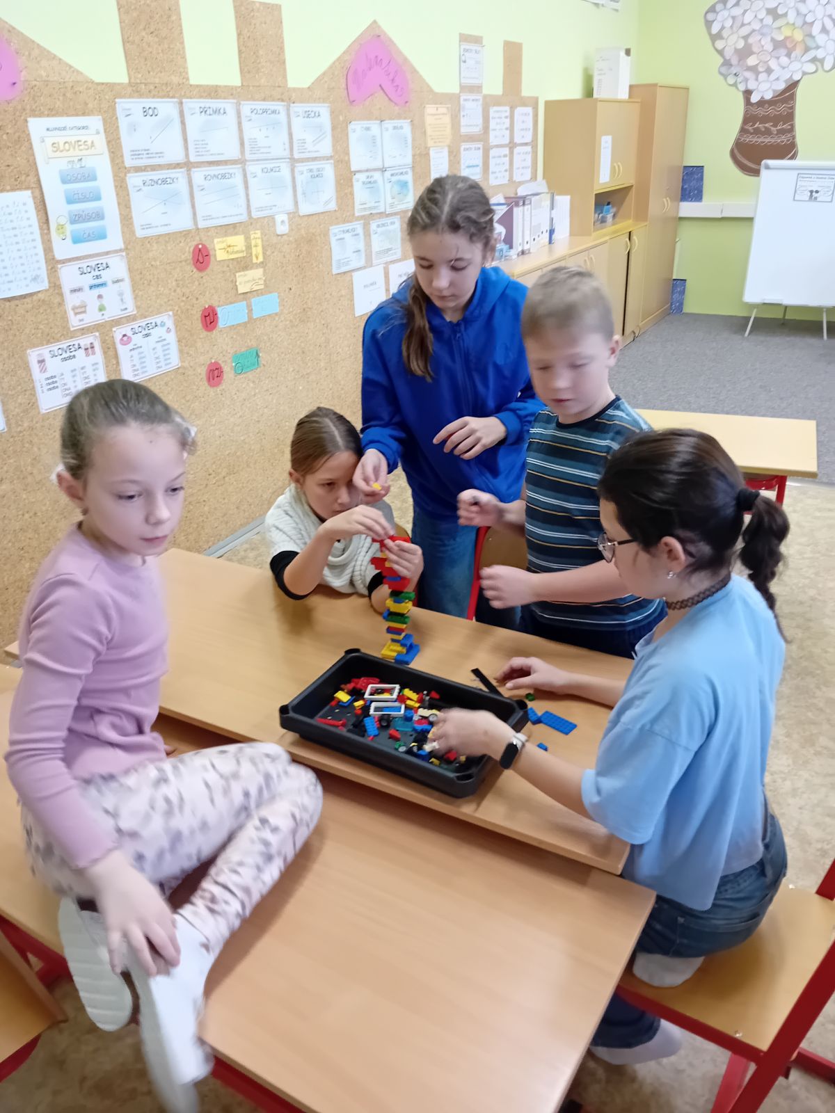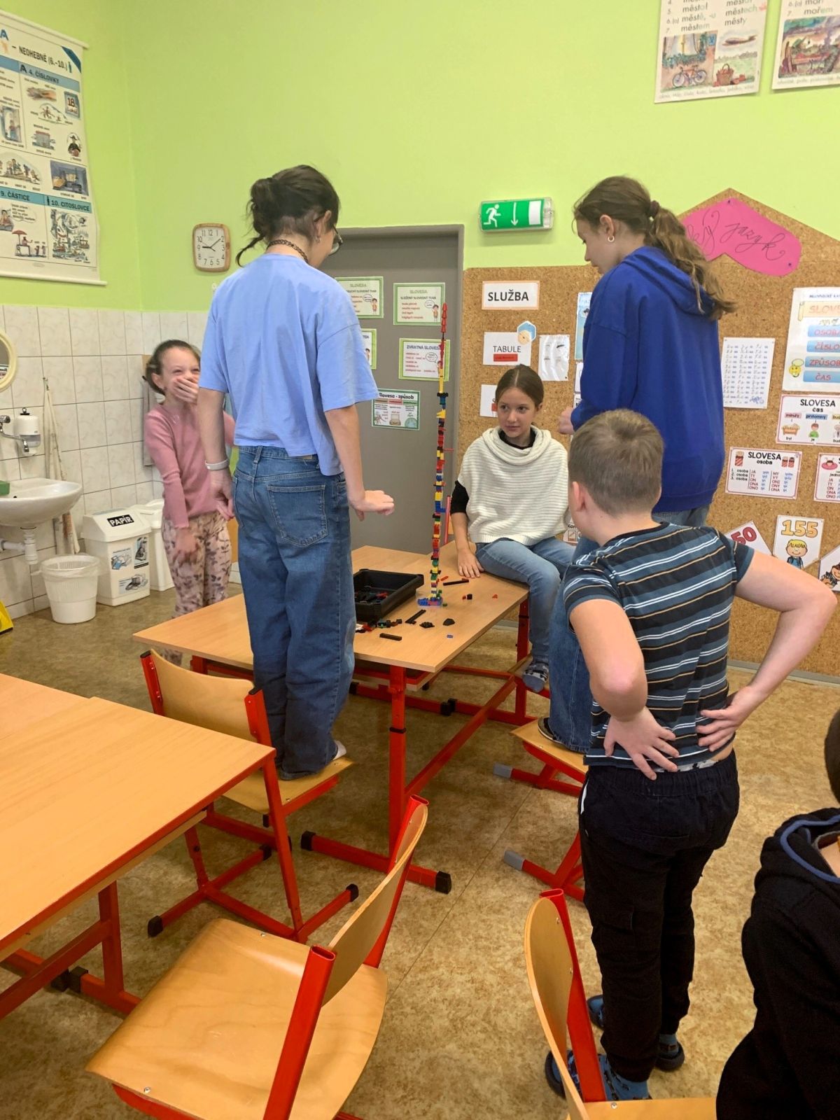Děti měly spoustu času i prostoru pro realizaci úkolů, které postupně dostávaly samostatně, ve dvojicích a ve skupinách. Nejprve stavěly různá zvířata v určitém čase. Občas v půli úkolu změnil pan lektor pravidla a děti musely rychle najít řešení, zvládnout se domluvit na novém postupu a ustát to emočně. Při stavění co největší věže zase vymýšlely taktiku, aby věž vydržela a nespadla. Poslední, nejtěžší úkol, postavit ve skupině most přes dvě lavice tak, aby vydržel zátěž láhve plné vody, byl velkou výzvou. Času bylo dostatek a nakonec to zvládly všechny skupiny. A co je nejdůležitější, každý po svém! Tak, jak to na ně čeká i v reálném životě.
